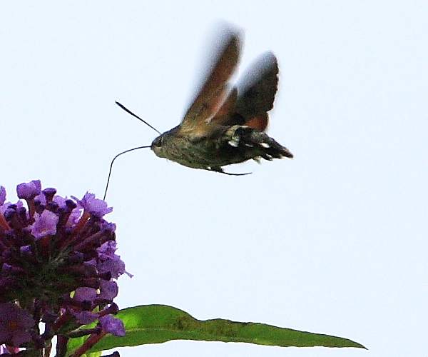Cette année les moro-spinx semblent moins nombreux et leurs visites sont brèves. Le premier est apparu le 5 août. Depuis, chaque jour ensoleillé, l'arbre à papillons reçoit la vsite d'au moins un sphinx-colibri, mais jamais plus d'un à la fois. Les plus tardifs arrivent vers neuf heures du soir, à la tombée de la nuit – on est en août – et repartent.