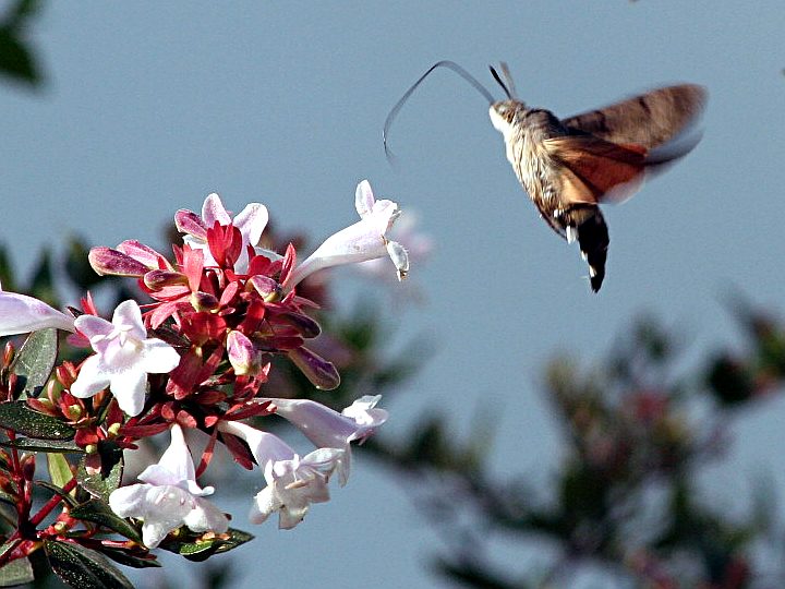 Je remercie Patricia Bavier de toutes ces magnifiques photographies d'un sphinx-colibri butinant les fleurs des abélias d'un jardin de Carnac.